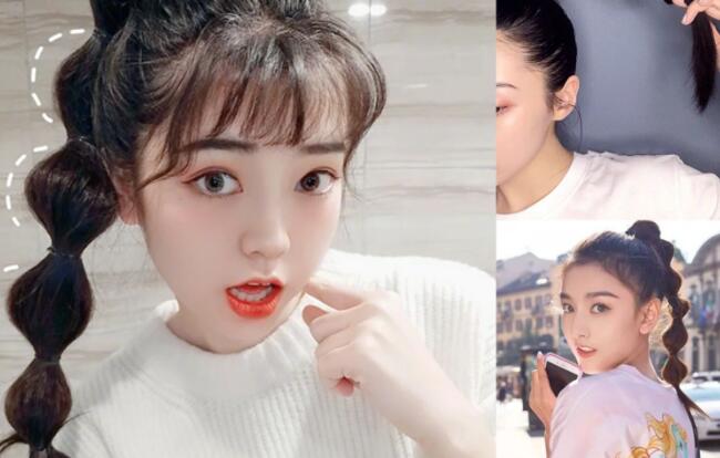 对于面部长相非常可爱甜美的姐妹,一定要试试双丸子头,然后前面流出空气刘海或者法式刘海,真的超级可爱,这款发型就是将双马尾扎成两个丸子头,非常简单。