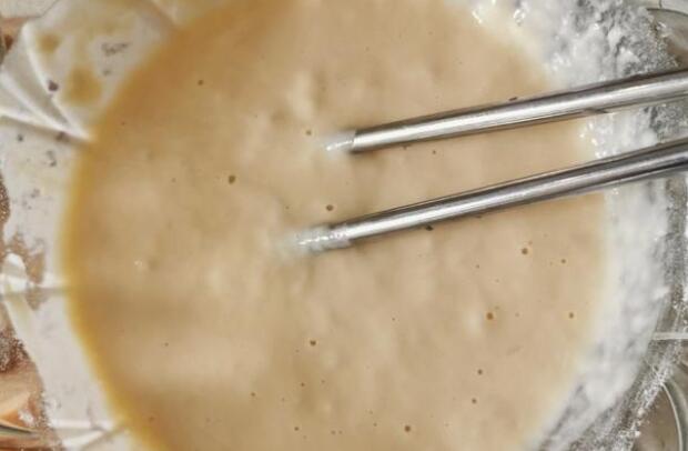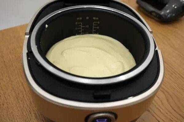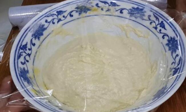 4、搅拌完后将保鲜膜盖在大碗上,然后放在一旁醒发,半个小时左右后,就可以将面糊直接倒入电饭煲中,但是在倒入前为了防止粘锅,在锅中刷上一层油。
