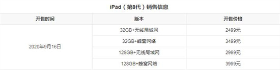 IPAD第八代是在2020年9月20日开始发售的,发售时的最低配置版本——32GB+无线局域网的价格是2499元,最贵的是128GB+蜂窝网络,要3999元才能到手,不过现在ipad第八代已经在京东停售了。