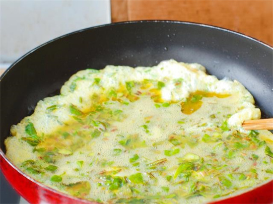 然后我们在平底锅倒入一定的油,像是摊鸡蛋煎饼一样,等待油温发热,把香椿蛋液混合物倒入锅中直至定型。