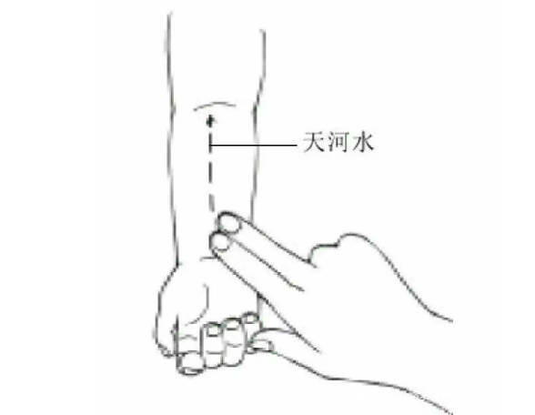 位置:天河水位于小儿前臂的正中线上,为腕横纹中点与肘横纹中点的连线的一条直线。