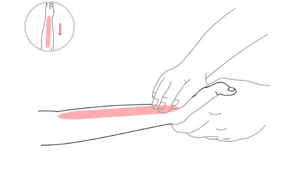 操作方法:使用拇指或将食指、中指并拢,用指腹沿着小儿前臂桡侧(外侧缘)自腕横纹向肘横纹推约300次。