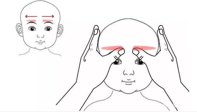 操作方法:使用双拇指指腹从小儿的眉心向两侧的眉梢处分别推50次。哎呦经验网 HtTP://WWw.KyLUnWEN.com